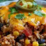 A comforting casserole combining hearty beef, zesty enchilada sauce, creamy cheese, and fluffy rice, perfect for weeknight dinners.