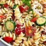 A refreshing pasta salad loaded with colorful vegetables and dressed in zesty Italian dressing, perfect for any occasion.