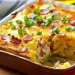 Breakfast casserole with hash browns, cheese, and eggs baked to perfection.