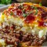 A classic comfort food dish combining savory meatloaf, creamy mashed potatoes, and melty cheddar cheese.