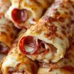 Cheesy pepperoni pizza roll ups with gooey cheese and crispy edges
