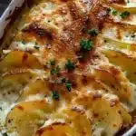 Repeat with the remaining potatoes, cream mixture, and cheeses, layering as before. It’s like a cheesy lasagna but with more potato love.