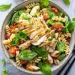 Delicious Chicken Caesar Pasta Salad with grilled chicken and romaine