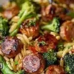 A heartwarming dish of chicken sausage, vibrant broccoli, and tender orzo pasta, perfect for busy weeknights or cozy dinners.