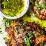 Delicious and easy grilled chicken thighs topped with tangy chimichurri sauce.