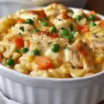 A comforting dish that combines the flavors of chicken pot pie with pasta, perfect for family meals.