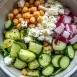 4. In a large bowl, combine the cottage cheese, chickpeas, cucumbers, and red onion.