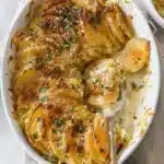 A comforting and indulgent side dish with layers of tender potatoes, rich cream, and melty cheese, perfect for any occasion.