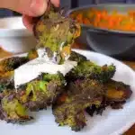 Enjoy: Serve the smashed broccoli chips warm with the tangy yogurt dipping sauce.