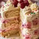 A fluffy and creamy cake that combines sugar cookie flavors with raspberry buttercream frosting. Perfect for any occasion!