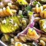 A refreshing and tangy pasta salad that combines rotini pasta with dill pickles, fresh vegetables, and a creamy dressing.