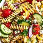 A fresh and vibrant pasta salad packed with healthy vegetables and a zesty dressing, perfect for picnics, potlucks, or family meals.