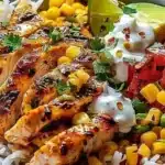 5. Assemble the Bowls: Start with a base of rice in each bowl. Top with sliced chicken, the street corn mixture, extra cotija cheese, and cilantro. Place a lime wedge on the side.