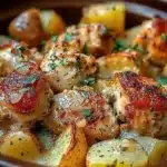 A hearty and comforting dish featuring tender chicken breasts and baby potatoes in a cheesy, garlicky sauce, perfect for busy days or cozy dinners.