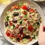 A vibrant Greek Orzo Salad with vegetables, feta cheese, and a zesty dressing