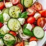 A refreshing and light salad combining crisp cucumbers, sweet cherry tomatoes, creamy mozzarella, and fragrant basil.