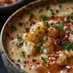 Ladle your warm, comforting soup into bowls and finish with a sprinkle of crumbled bacon on top. Garnish with chives or green onions for that final touch of freshness and vibrant color.