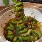 A fresh and vibrant Korean-inspired salad featuring spiral cut mini cucumbers mixed with flavorful seasonings, making it a perfect side dish for any meal.
