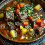 A hearty and comforting vegetable beef soup that brings warmth and nostalgia, filled with tender beef and vibrant vegetables.