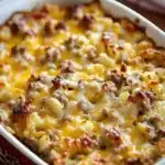 A hearty breakfast casserole packed with sausage, eggs, cheese, and crispy hash browns, perfect for feeding a crowd or a family breakfast.