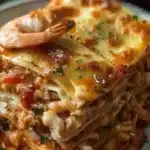 A delicious lasagna layered with shrimp, crab, and a mix of cheeses, perfect for a comforting meal.