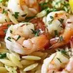 A vibrant dish featuring tender shrimp and perfectly cooked orzo with zesty lemon and garlic flavors, perfect for any occasion.