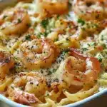 A flavorful shrimp scampi pasta bake combining tender shrimp, rich cream, and savory cheese, perfect for any occasion.