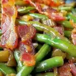 A classic side dish featuring fresh green beans cooked with crispy bacon and savory seasonings.