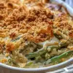 A comforting Southern-style green bean casserole with a creamy mushroom sauce and crispy fried onions, perfect for family gatherings and holidays.