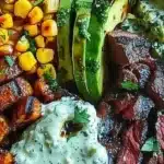 A vibrant bowl featuring grilled steak, creamy avocado, and sweet roasted corn, topped with a zesty cilantro cream sauce.