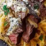 A creamy and delicious Steak Gorgonzola Alfredo served over spaghetti squash, perfect for a quick yet gourmet dinner.