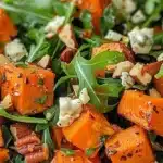 A healthy and delicious salad featuring roasted sweet potatoes, peppery arugula, and crumbled feta cheese, perfect for any occasion.