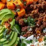 Delicious taco bowls featuring roasted sweet potatoes and seasoned ground beef, customizable for any dietary preference.