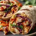 A delicious wrap filled with marinated chicken, crunchy Asian slaw, and creamy peanut sauce, perfect for lunch or dinner.