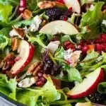A delightful holiday salad featuring mixed greens, fresh apples, pomegranate seeds, blue cheese, and candied pecans, topped with a homemade vinaigrette.
